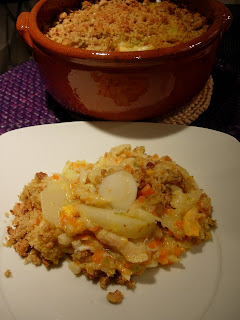 Num recipiente de barro coloque uma camada de batatas, outra de ovo cozido partido às rodelas e outra de refogado de bacalhau.